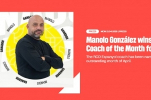 体育资讯4月21日讯 西甲官网消息,西班牙人主帅马诺洛-冈萨雷斯获评4月最佳教练。