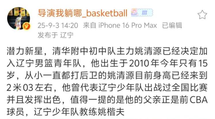 辽宁男篮这个休赛期的操作有些让球迷失望,不过球队有着自己的规划。按照辽沈晚报透露的消息,辽宁男篮在这个夺冠窗口已过的情况下,已经将目光放在了下一个十年,球队会在完成新老交替后再度崛起。就在日前,辽宁男篮已经开始为未来十年做准备了,开始屯一些好苗子。据媒体人“导演我躺哪儿”透露,球队已经签下了15岁的潜力小将姚清源,姚清源已经正式加盟球队青年队队效力。
