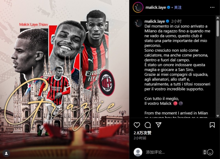 8月14日讯 夏窗佳夫从米兰转会纽卡,交易已经官宣。这名后卫在个人社媒发文,向米兰告别。