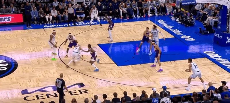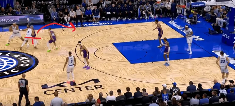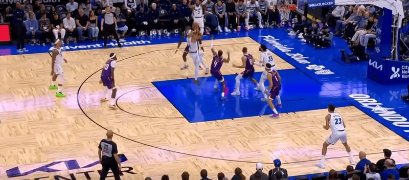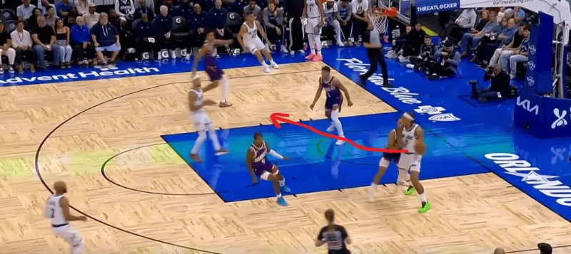 班凯罗这一次在右侧持球,太阳选择了区域防守在右侧布置,萨格斯立刻横切到左侧重新落位,班凯罗迅速甩对角助攻萨格斯命中空位关键三分: