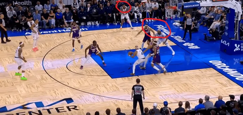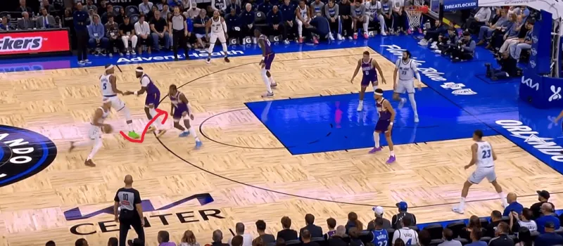 班凯罗弧顶持球策应,右侧萨格斯和小卡特打了无球端的flare slip,卡特掩护助萨格斯向底线远切,随后卡特再迅速溜至篮下,萨格斯接班凯罗传球突破禁区,利用弱侧底线布克回收协防卡特的站位找到空位的卡因: